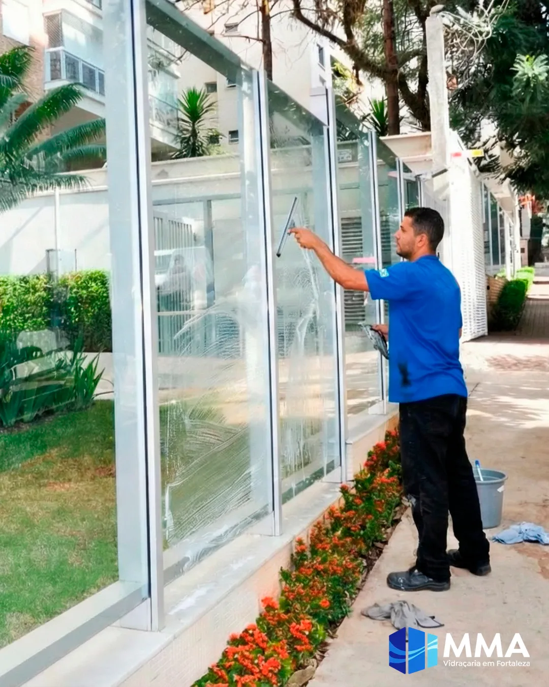 O trabalho não se limita apenas à superfície do vidro. A limpeza abrange também as ferragens, perfis de alumínio, trilhos e demais acessórios que compõem a estrutura.
